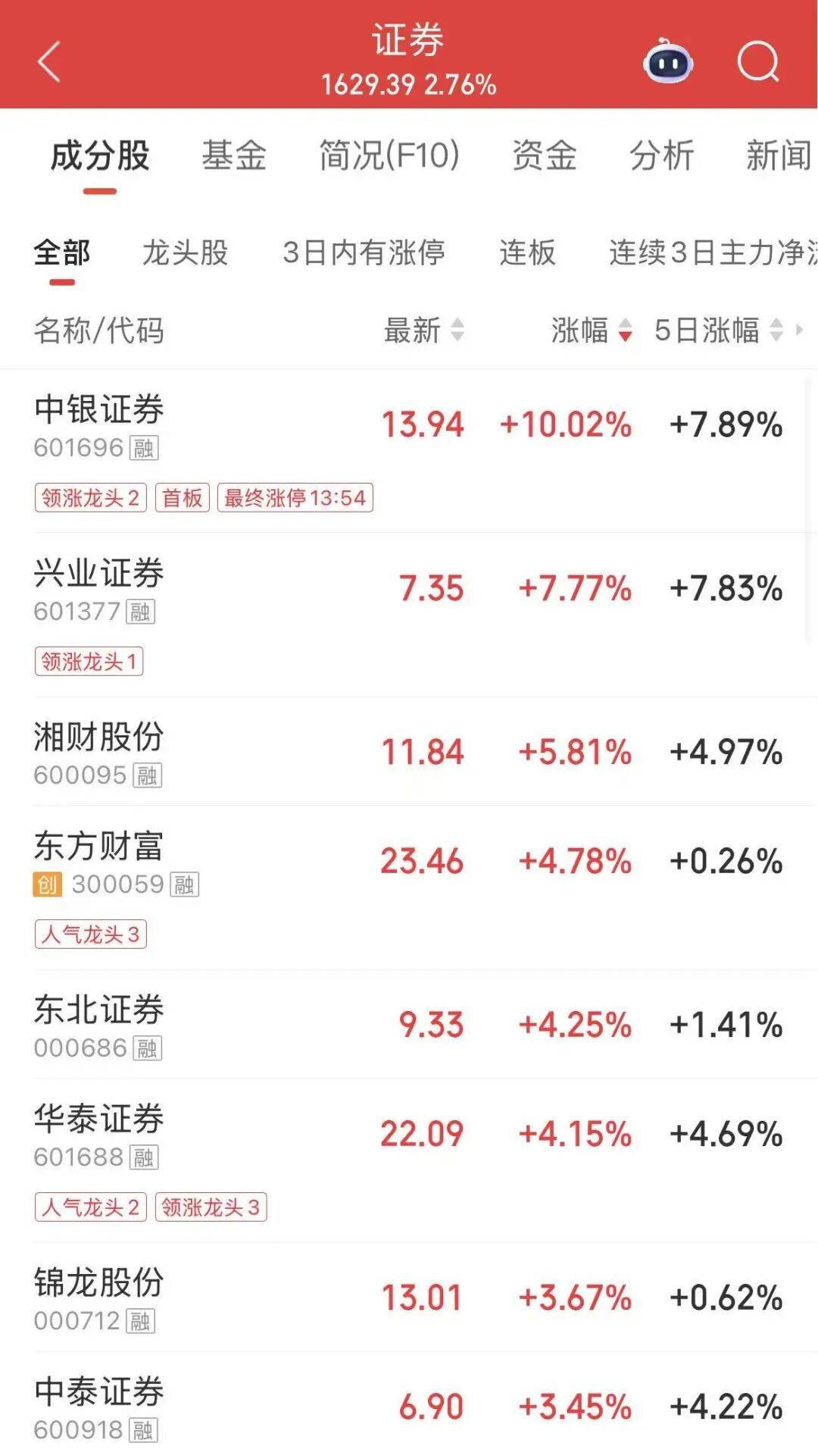 午后,保险、证券、互联网金融等大金融板块持续拉升。瑞达期货直线拉升封板,中银证券涨停,兴业证券涨超7%,湘财股份、东方财富、东北证券、华泰证券跟涨。