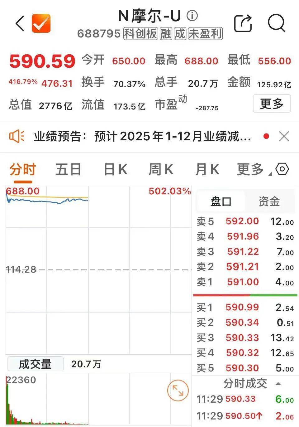 今日开盘后,摩尔线程股价一度快速冲高,最高触及688.00元/股,对应涨幅超过500%;随后震荡回落,截至午盘报590.59元/股,涨幅416.79%;半日成交125.9亿元,居所有A股首位,最新总市值2776亿元。