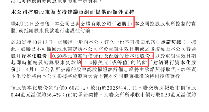 在推进债务重组过程中,控股股东发挥了关键作用。10月13日,控股股东所控制的实体必胜有限公司签署不可撤回承诺,以每股0.60港元的价格,将11.4亿美元股东贷款的结余部分全额转股。