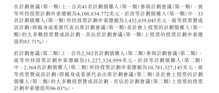 此次参与投票的债权人规模庞大,第一类计划债权人会议有41名债权人参与,投票债权总额达41亿美元;第二类计划债权人会议更是吸引了2382名债权人参与,债权总额约112.3亿美元。
