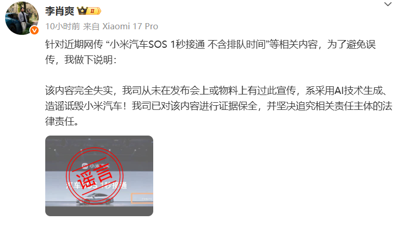 上证报中国证券网讯 针对近期网传“小米汽车SOS 1秒接通 不含排队时间”等相关内容,小米汽车副总裁李肖爽近日在个人微博中作出说明:该内容完全失实,我司从未在发布会上或物料上有过此宣传,系采用AI技术生成、造谣诋毁小米汽车!我司已对该内容进行证据保全,并坚决追究相关责任主体的法律责任。